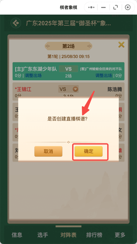 2. 棋谱直播员,直接点击对阵列表,创建棋谱直播或者录谱;
